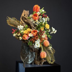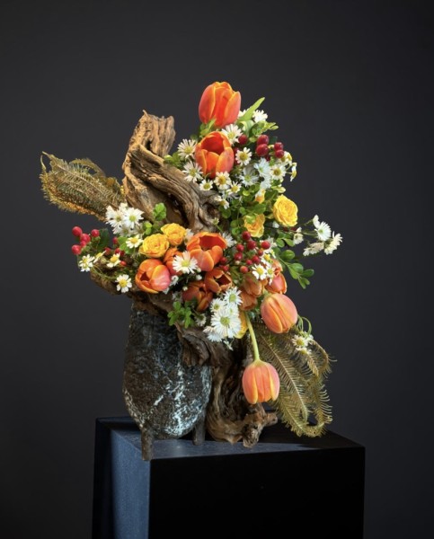 A larger, more dramatic piece using my handmade ceramic vessel paired with natural driftwood. This session highlights artistic freestyle composition and seasonal blooms arranged in harmony with raw materials.